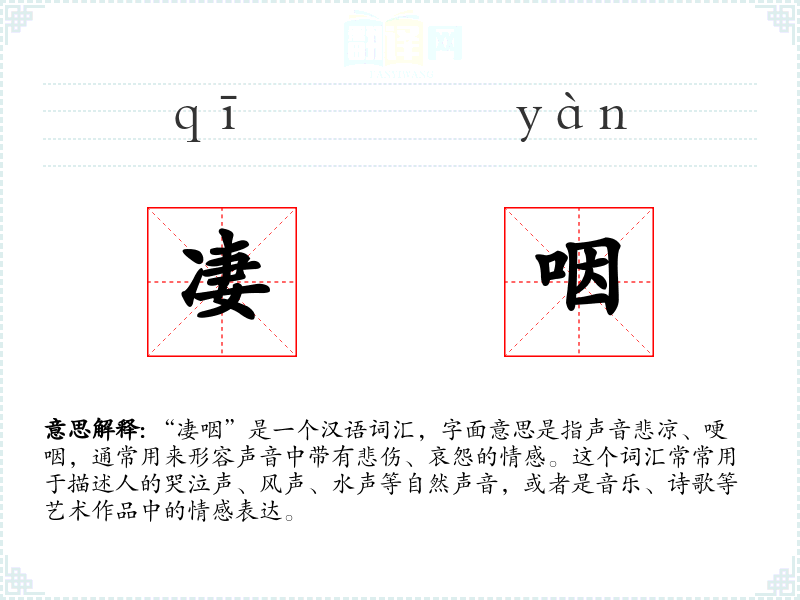 “凄咽”一词的词源较为古老,其演变过程反映了汉语词汇的丰富性和情感表达的细腻性。在古代文学作品中,这个词汇就已经被广泛使用,用以表达深切的悲伤和哀怨。