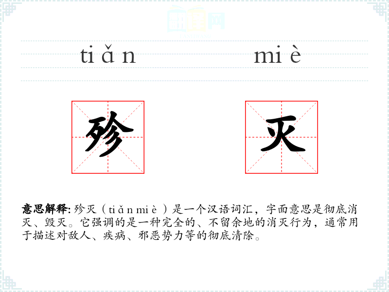 - 文学:在文学作品中,“殄灭”常用于描述战争、灾难或英雄主义行为,如“殄灭敌寇”、“殄灭瘟疫”。