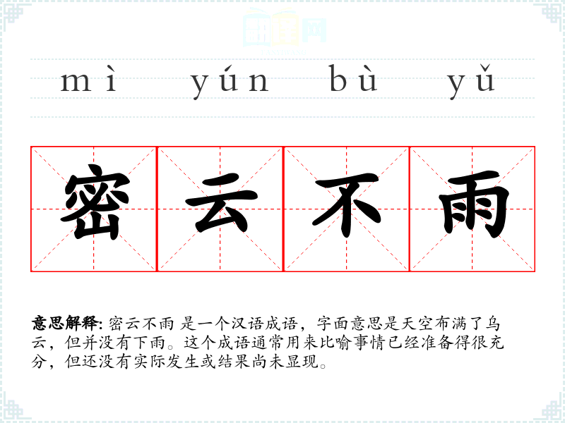 密云不雨 是一个汉语成语,字面意思是天空布满了乌云,但并没有下雨。这个成语通常用来比喻事情已经准备得很充分,但还没有实际发生或结果尚未显现。