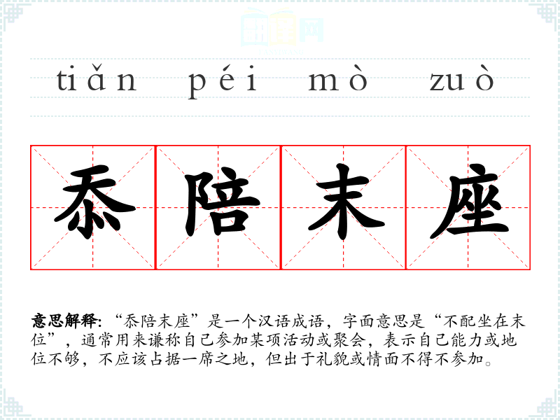 “忝陪末座”是一个汉语成语,字面意思是“不配坐在末位”,通常用来谦称自己参加某项活动或聚会,表示自己能力或地位不够,不应该占据一席之地,但出于礼貌或情面不得不参加。