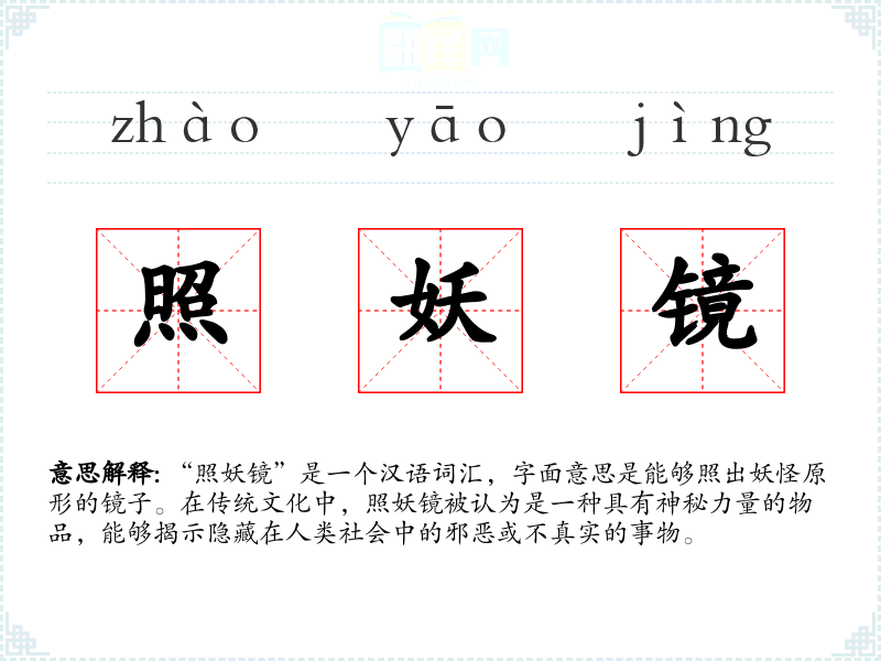 “照妖镜”是一个汉语词汇,字面意思是能够照出妖怪原形的镜子。在传统文化中,照妖镜被认为是一种具有神秘力量的物品,能够揭示隐藏在人类社会中的邪恶或不真实的事物。