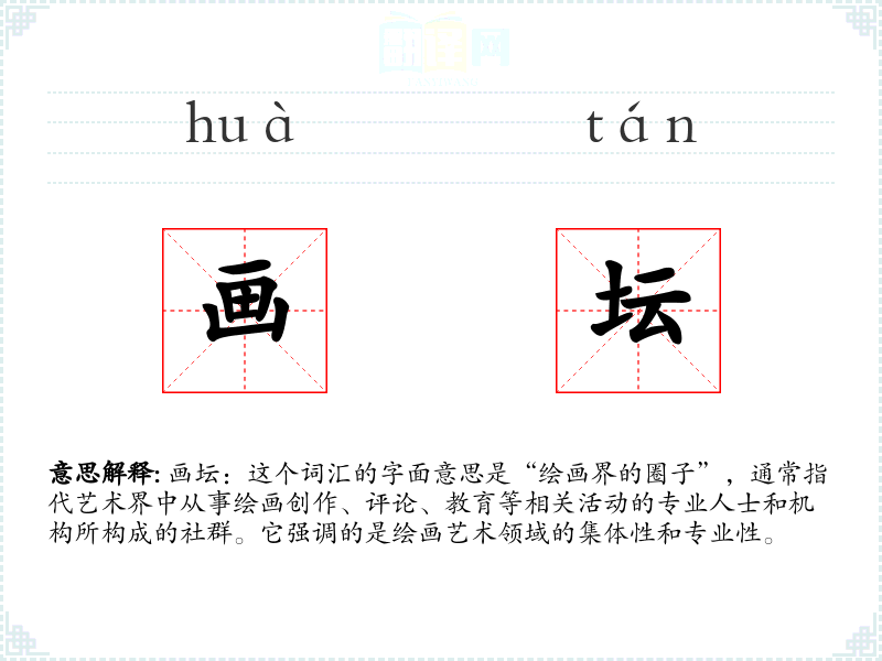 画坛:这个词汇的字面意思是“绘画界的圈子”,通常指代艺术界中从事绘画创作、评论、教育等相关活动的专业人士和机构所构成的社群。它强调的是绘画艺术领域的集体性和专业性。