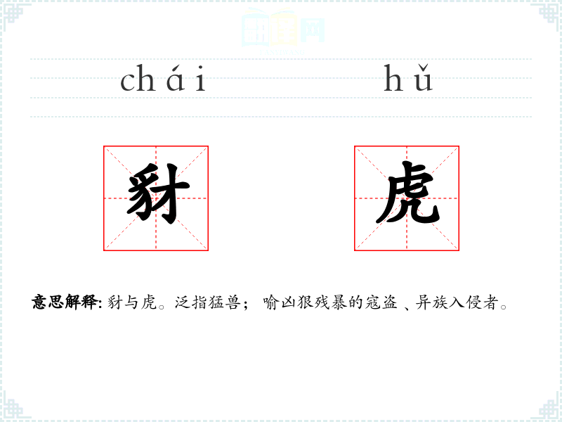 豺与虎。泛指猛兽; 喻凶狠残暴的寇盗﹑异族入侵者。