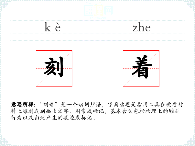“刻着”是一个动词短语,字面意思是指用工具在硬质材料上雕刻或刻画出文字、图案或标记。基本含义包括物理上的雕刻行为以及由此产生的痕迹或标记。