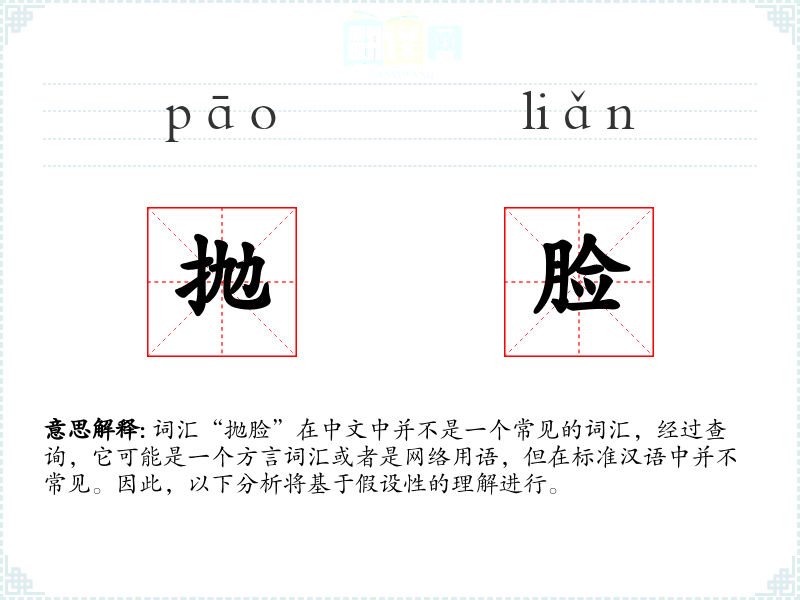 词汇“抛脸”在中文中并不是一个常见的词汇,经过查询,它可能是一个方言词汇或者是网络用语,但在标准汉语中并不常见。因此,以下分析将基于假设性的理解进行。