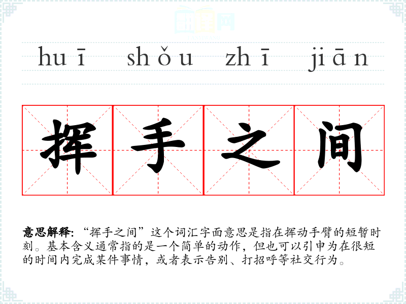 “挥手之间”这个词汇字面意思是指在挥动手臂的短暂时刻。基本含义通常指的是一个简单的动作,但也可以引申为在很短的时间内完成某件事情,或者表示告别、打招呼等社交行为。