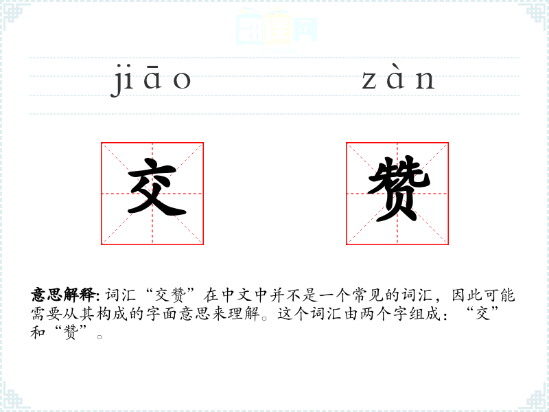 词汇“交赞”在中文中并不是一个常见的词汇,因此可能需要从其构成的字面意思来理解。这个词汇由两个字组成:“交”和“赞”。