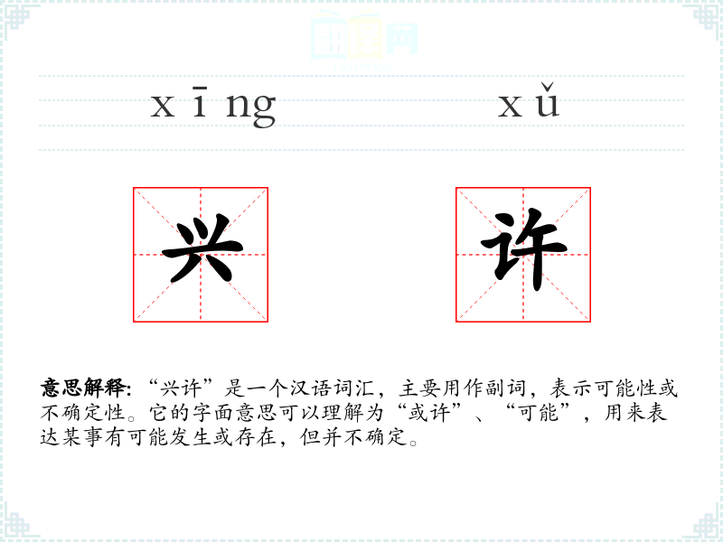 “兴许”是一个汉语词汇,主要用作副词,表示可能性或不确定性。它的字面意思可以理解为“或许”、“可能”,用来表达某事有可能发生或存在,但并不确定。