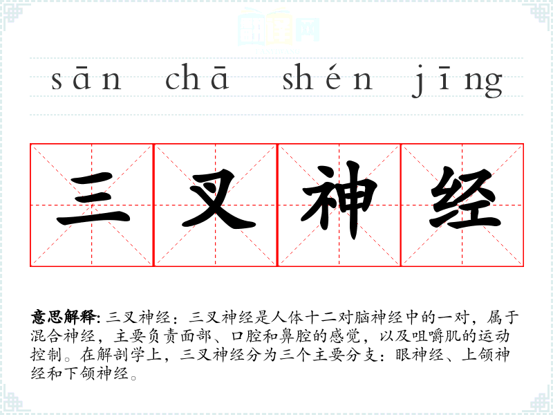 - 词源:“三叉”源自拉丁语“trigeminus”,意为“三重的”,指的是神经的三个主要分支。