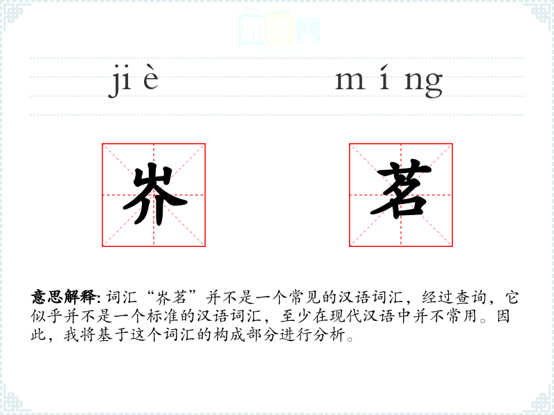 “岕”字在现代汉语中不常用,它可能是一个古字或方言字,没有明确的现代含义。 “茗”字在现代汉语中指的是茶叶,尤其是指好的茶叶。