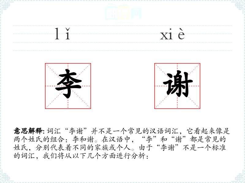 - 在其他语言或文化中,可能没有直接对应“李谢”的词汇,但“李”和“谢”作为姓氏在华人社区中是普遍存在的。