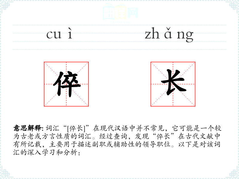 词汇“[倅长]”在现代汉语中并不常见,它可能是一个较为古老或方言性质的词汇。经过查询,发现“倅长”在古代文献中有所记载,主要用于描述副职或辅助性的领导职位。以下是对该词汇的深入学习和分析: