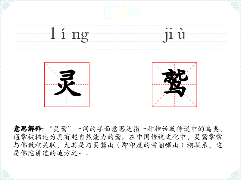 “灵鹫”一词的字面意思是指一种神话或传说中的鸟类,通常被描述为具有超自然能力的鹫。在传统文化中,灵鹫常常与相关联,尤其是与灵鹫山(即印度的耆阇崛山)相联系,这是佛陀讲道的地方之一。