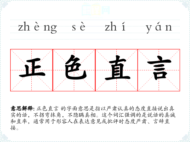 正色直言 的字面意思是指以严肃认真的态度直接说出真实的话,不拐弯抹角,不隐瞒真相。这个词汇强调的是说话的真诚和直率,通常用于形容人在表达意见或批评时态度严肃、言辞直接。