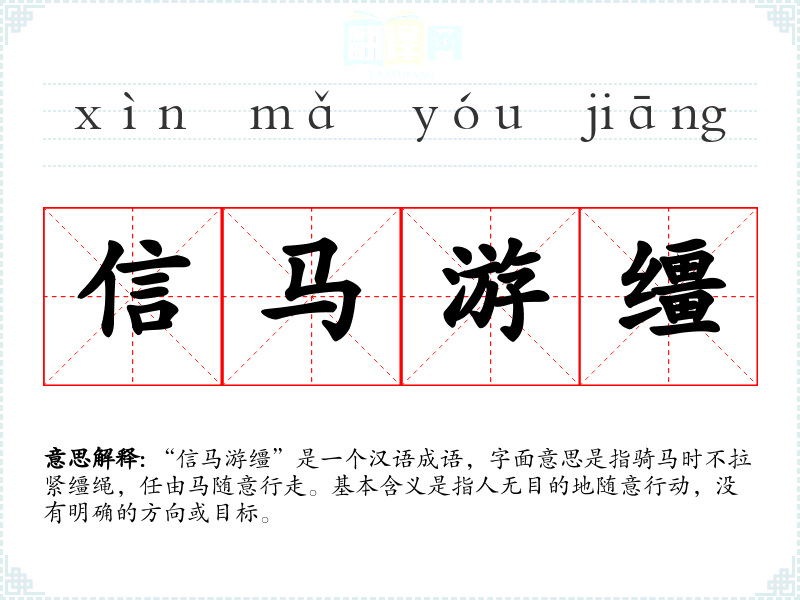 “信马游缰”是一个汉语成语,字面意思是指骑马时不拉紧缰绳,任由马随意行走。基本含义是指人无目的地随意行动,没有明确的方向或目标。