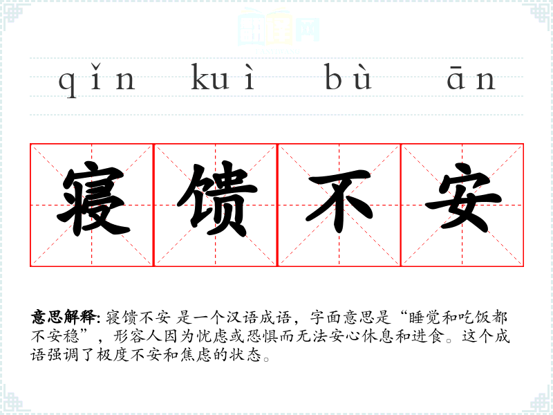 寝馈不安 是一个汉语成语,字面意思是“睡觉和吃饭都不安稳”,形容人因为忧虑或恐惧而无法安心休息和进食。这个成语强调了极度不安和焦虑的状态。