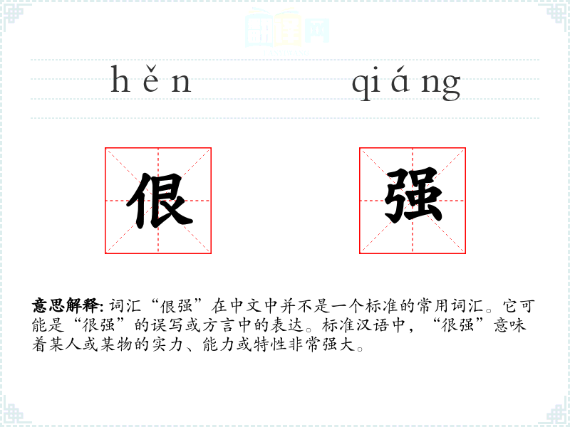 词汇“佷强”在中文中并不是一个标准的常用词汇。它可能是“很强”的误写或方言中的表达。标准汉语中,“很强”意味着某人或某物的实力、能力或特性非常强大。