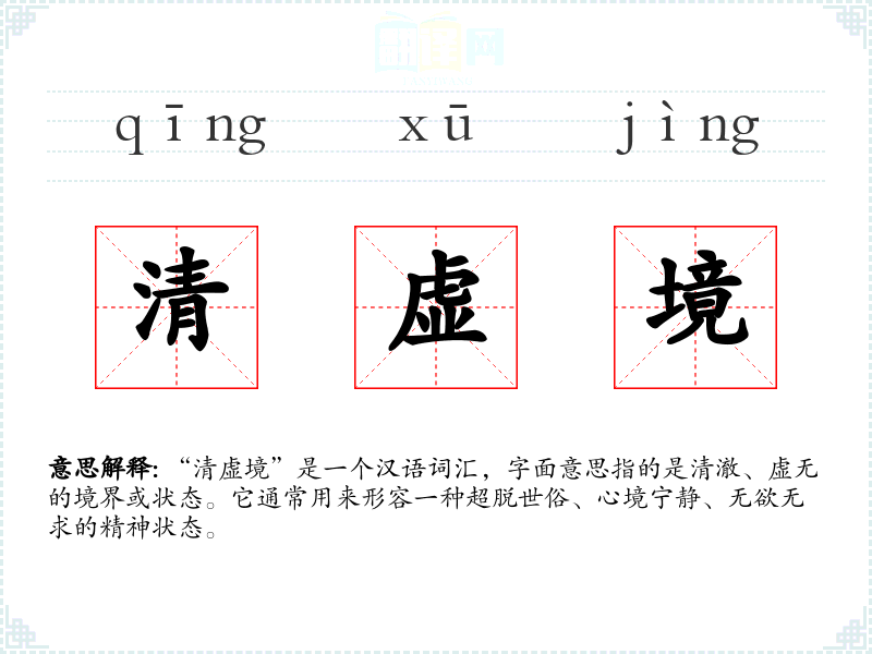 “清虚境”是一个汉语词汇,字面意思指的是清澈、虚无的境界或状态。它通常用来形容一种超脱世俗、心境宁静、无欲无求的精神状态。