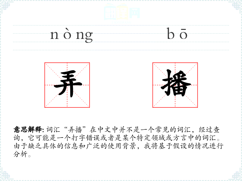 词汇“弄播”在中文中并不是一个常见的词汇,经过查询,它可能是一个打字错误或者是某个特定领域或方言中的词汇。由于缺乏具体的信息和广泛的使用背景,我将基于假设的情况进行分析。