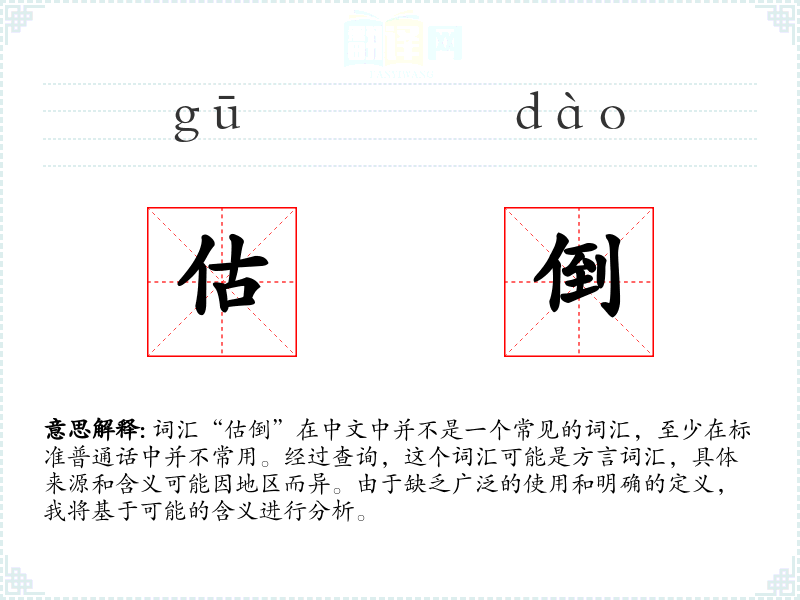 由于“估倒”不是一个标准词汇,我们无法给出一个确切的字面意思和基本含义。它可能是某个方言中的词汇,用于表示估计、猜测或推测的意思。