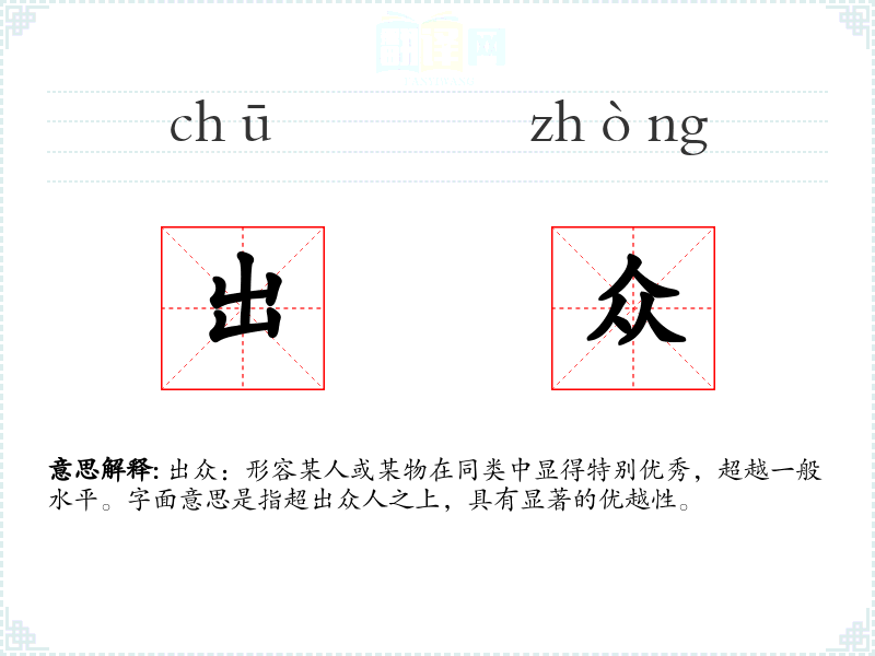 出众:形容某人或某物在同类中显得特别优秀,超越一般水平。字面意思是指超出众人之上,具有显著的优越性。