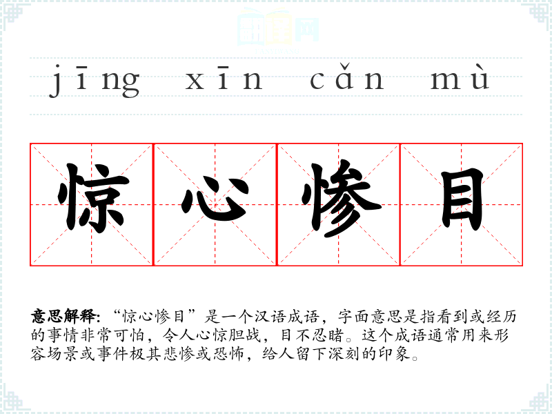 “惊心惨目”是一个汉语成语,字面意思是指看到或经历的事情非常可怕,令人心惊胆战,目不忍睹。这个成语通常用来形容场景或**极其悲惨或恐怖,给人留下深刻的印象。