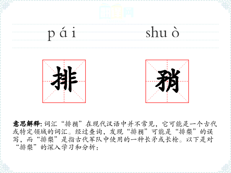 - 词源:排槊这个词源于古代汉语,具体词源不详,但可以推测与古代战争中的武器和战术有关。