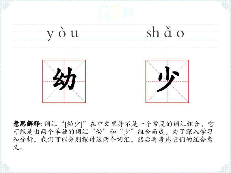 词汇“[幼少]”在中文里并不是一个常见的词汇组合,它可能是由两个单独的词汇“幼”和“少”组合而成。为了深入学*和分析,我们可以分别探讨这两个词汇,然后再考虑它们的组合意义。