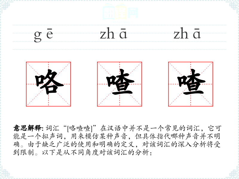 - 理解:“咯喳喳”是一个不明确的拟声词,其具体含义和使用场景不明确。