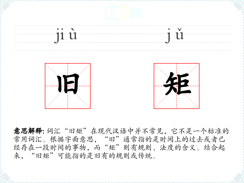 词汇“旧矩”在现代汉语中并不常见,它不是一个标准的常用词汇。根据字面意思,“旧”通常指的是时间上的过去或者已经存在一段时间的事物,而“矩”则有规则、法度的含义。结合起来,“旧矩”可能指的是旧有的规则或传统。