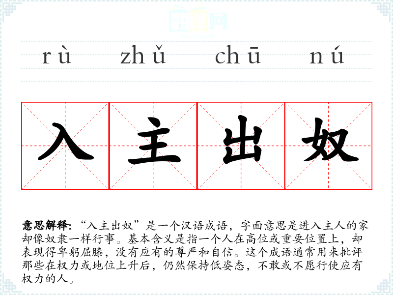 “入主出奴”是一个汉语成语,字面意思是进入主人的家却像奴隶一样行事。基本含义是指一个人在高位或重要位置上,却表现得卑躬屈膝,没有应有的尊严和自信。这个成语通常用来批评那些在权力或地位上升后,仍然保持低姿态,不敢或不愿行使应有权力的人。