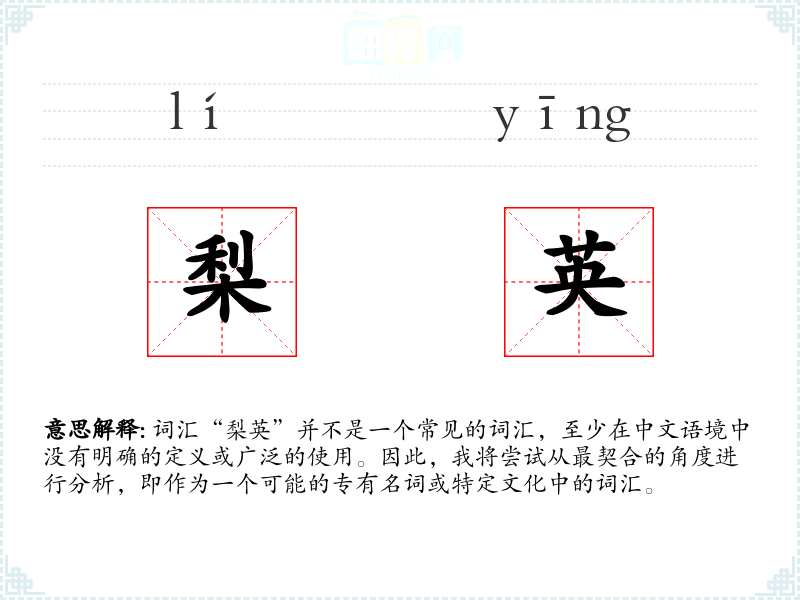 由于“梨英”不是一个标准的中文词汇,它可能是一个专有名词,比如人名、地名或其他特定场合的命名。如果是一个人名,它可能是某个人的名字或笔名;如果是一个地名,它可能是某个地方的别称或古称。