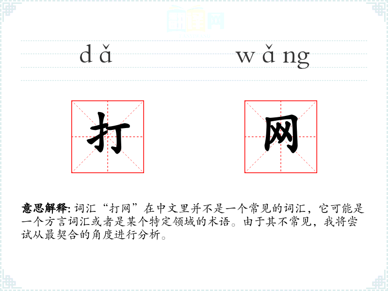 “打网”这个词汇的字面意思可能是指“铺设网”或“编织网”,但在现代标准汉语中,这个词汇并不常用,可能需要具体的上下文来确定其确切含义。
