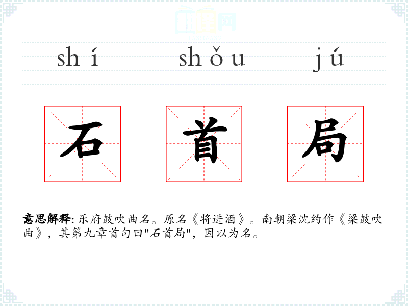 乐府鼓吹曲名。原名《将进酒》。南朝梁沈约作《梁鼓吹曲》,其第九章首句曰"石首局",因以为名。