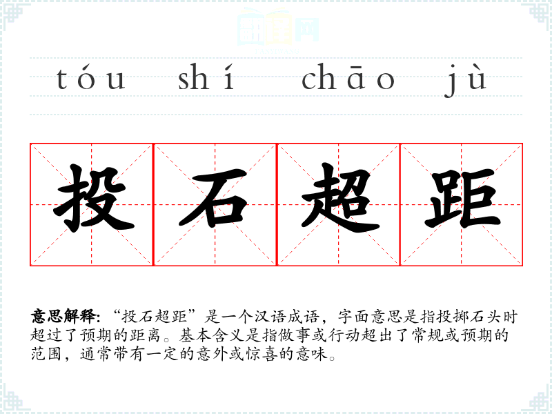 “投石超距”是一个汉语成语,字面意思是指投掷石头时超过了预期的距离。基本含义是指做事或行动超出了常规或预期的范围,通常带有一定的意外或惊喜的意味。