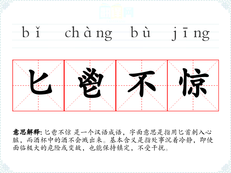 匕鬯不惊 是一个汉语成语,字面意思是指用匕首刺入心脏,而酒杯中的酒不会溅出来。基本含义是指处事沉着冷静,即使面临极大的危险或变故,也能保持镇定,不受干扰。