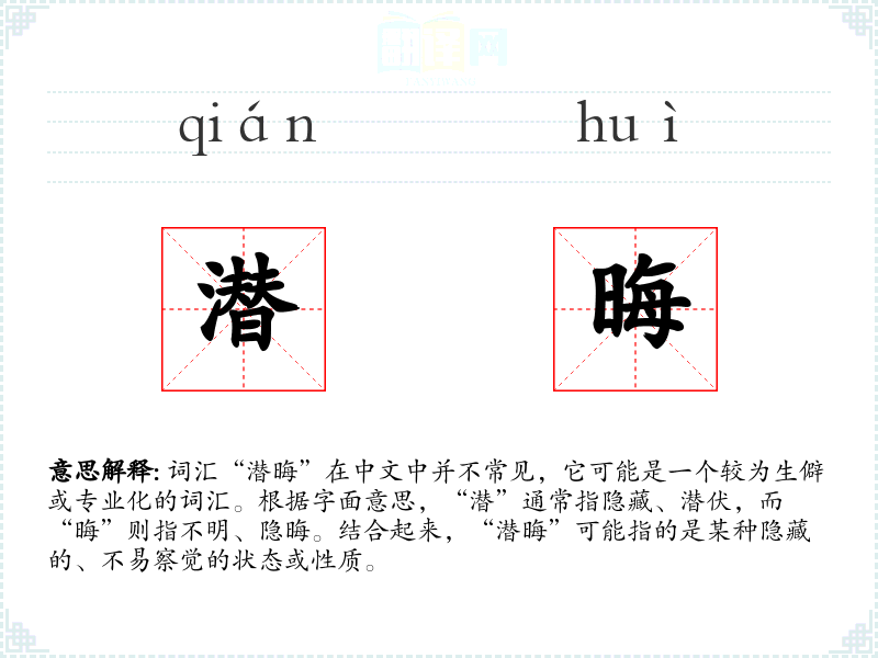 词汇“潜晦”在中文中并不常见,它可能是一个较为生僻或专业化的词汇。根据字面意思,“潜”通常指隐藏、潜伏,而“晦”则指不明、隐晦。结合起来,“潜晦”可能指的是某种隐藏的、不易察觉的状态或性质。