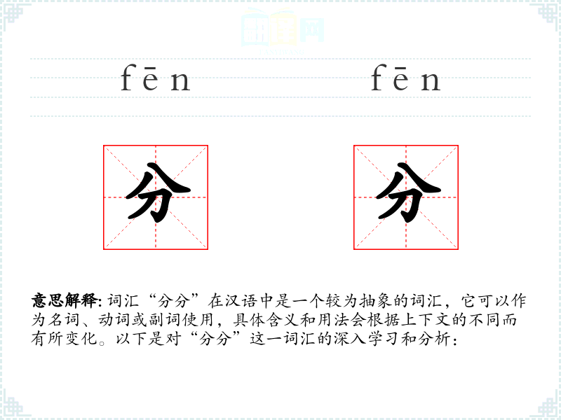 词汇“分分”在汉语中是一个较为抽象的词汇,它可以作为名词、动词或副词使用,具体含义和用法会根据上下文的不同而有所变化。以下是对“分分”这一词汇的深入学*和分析: