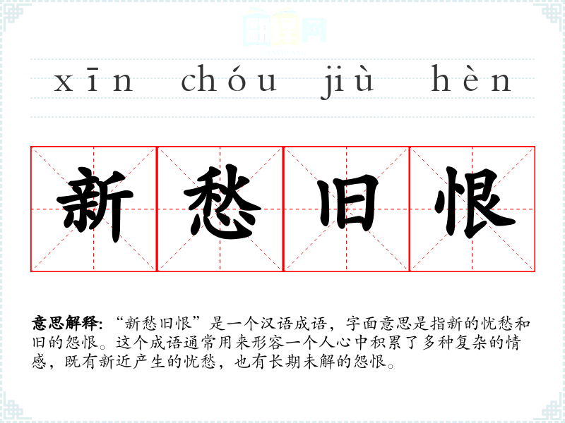 “新愁旧恨”是一个汉语成语,字面意思是指新的忧愁和旧的怨恨。这个成语通常用来形容一个人心中积累了多种复杂的情感,既有新近产生的忧愁,也有长期未解的怨恨。