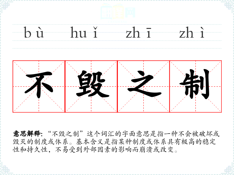 “不毁之制”这个词汇的字面意思是指一种不会被破坏或毁灭的制度或体系。基本含义是指某种制度或体系具有极高的稳定性和持久性,不易受到外部因素的影响而崩溃或改变。