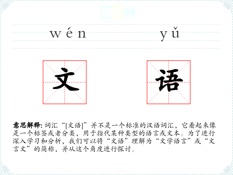 词汇“[文语]”并不是一个标准的汉语词汇,它看起来像是一个标签或者分类,用于指代某种类型的语言或文本。为了进行深入学*和分析,我们可以将“文语”理解为“文学语言”或“文言文”的简称,并从这个角度进行探讨。
