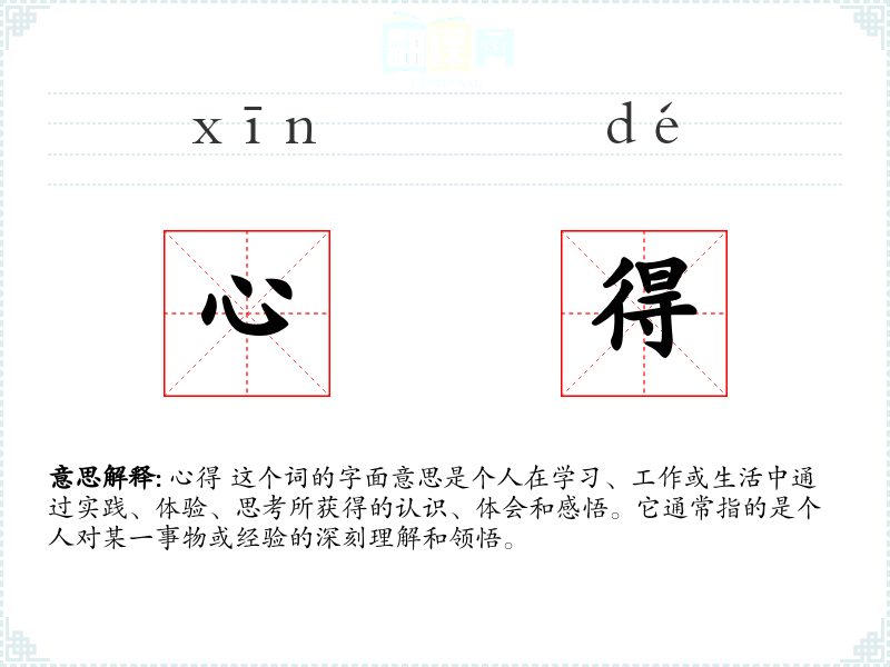 心得 这个词源于汉语,由“心”和“得”两个字组成。在古代汉语中,“心”常指内心、思想,“得”则表示获得、得到。随着时间的推移,这个词逐渐演变成表示个人通过思考和体验获得的深刻认识。