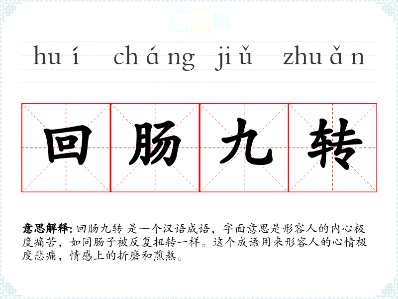 回肠九转 是一个汉语成语,字面意思是形容人的内心极度痛苦,如同肠子被反复扭转一样。这个成语用来形容人的心情极度悲痛,情感上的折磨和煎熬。
