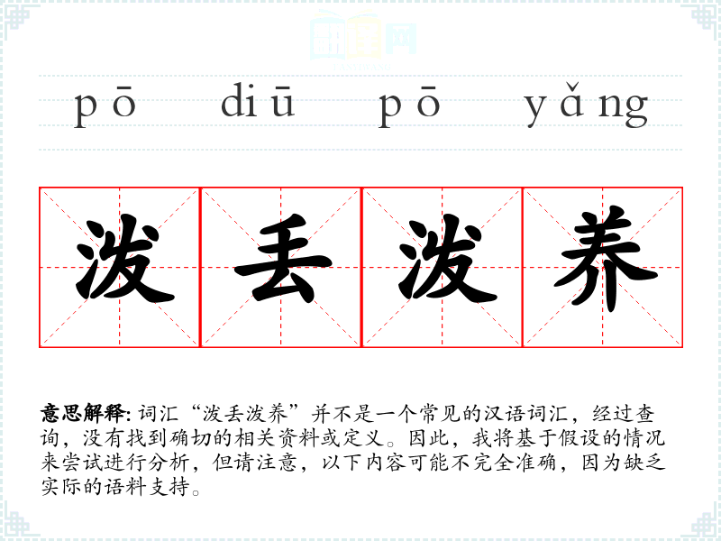 词汇“泼丢泼养”并不是一个常见的汉语词汇,经过查询,没有找到确切的相关资料或定义。因此,我将基于假设的情况来尝试进行分析,但请注意,以下内容可能不完全准确,因为缺乏实际的语料支持。