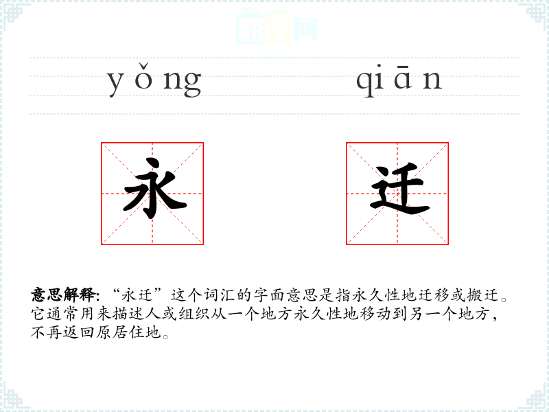 在不同语言中,“永迁”可能有不同的表达方式,但其核心意义相似,都是指永久性的迁移。例如,在英语中,可以用“permanent relocation”来表达。