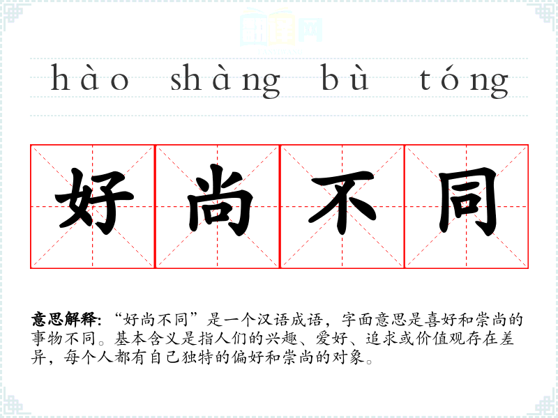 “好尚不同”是一个汉语成语,字面意思是喜好和崇尚的事物不同。基本含义是指人们的兴趣、爱好、追求或价值观存在差异,每个人都有自己独特的偏好和崇尚的对象。