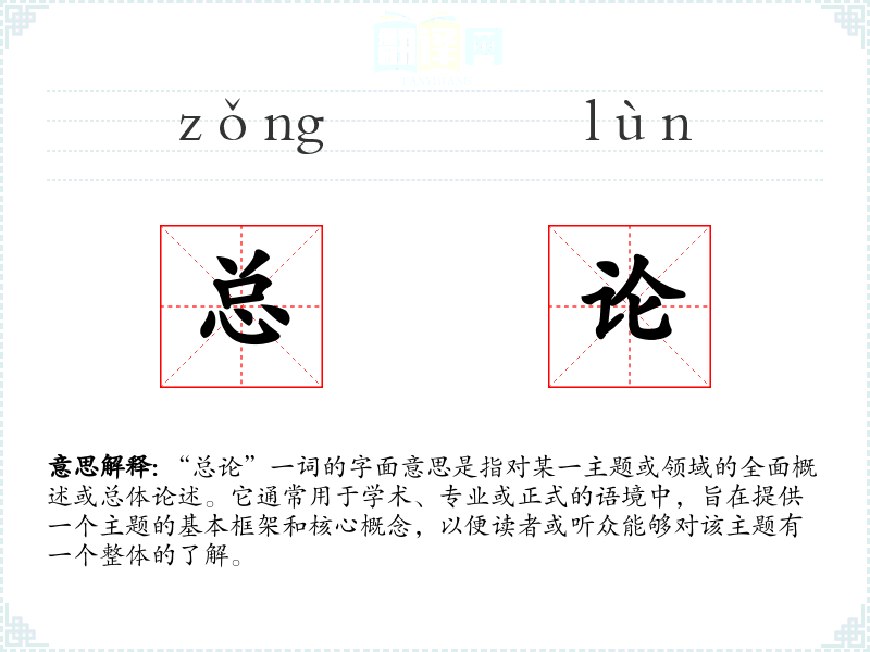 “总论”一词的字面意思是指对某一主题或领域的全面概述或总体论述。它通常用于学术、专业或正式的语境中,旨在提供一个主题的基本框架和核心概念,以便读者或听众能够对该主题有一个整体的了解。