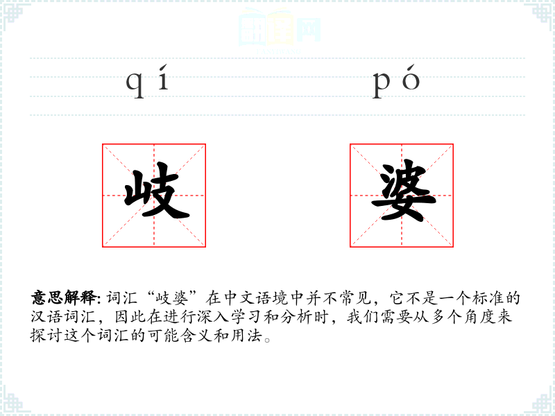 由于“岐婆”不是一个标准汉语词汇,它在不同语境下的使用可能非常有限。如果它是一个方言词汇,那么它可能只在某个特定的地区或社群中使用。