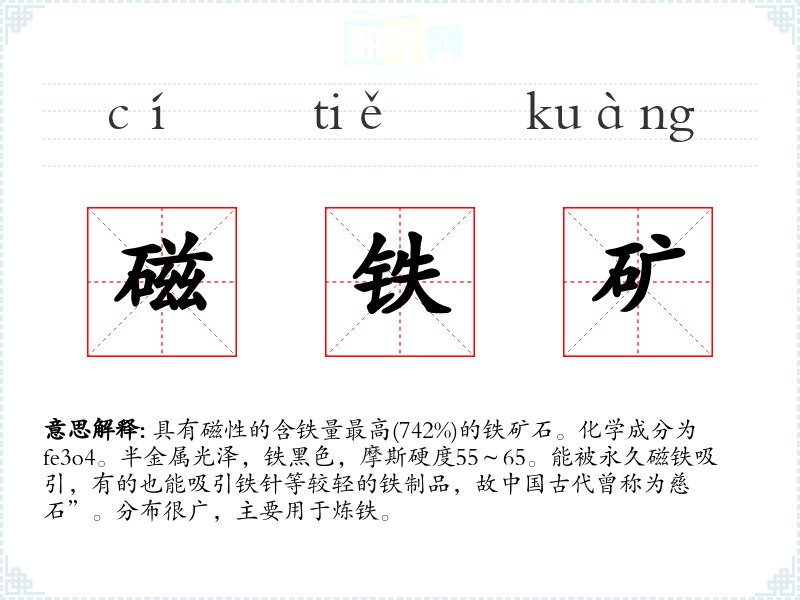 1.具有磁性的含铁量最高(742%)的铁矿石。化学成分为fe3o4。半金属光泽,铁黑色,摩斯硬度55~65。能被永久磁铁吸引,有的也能吸引铁针等较轻的铁制品,故中国古代曾称为慈石”。分布很广,主要用于炼铁。