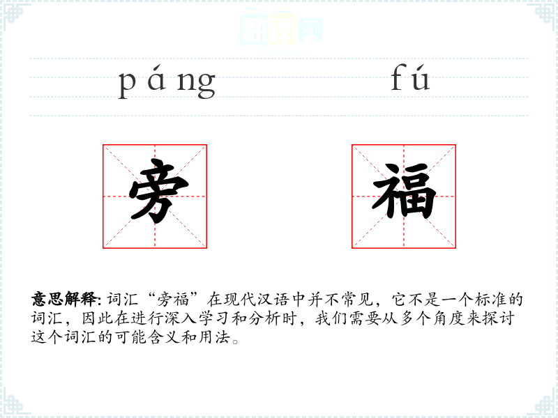 词汇“旁福”在现代汉语中并不常见,它不是一个标准的词汇,因此在进行深入学*和分析时,我们需要从多个角度来探讨这个词汇的可能含义和用法。